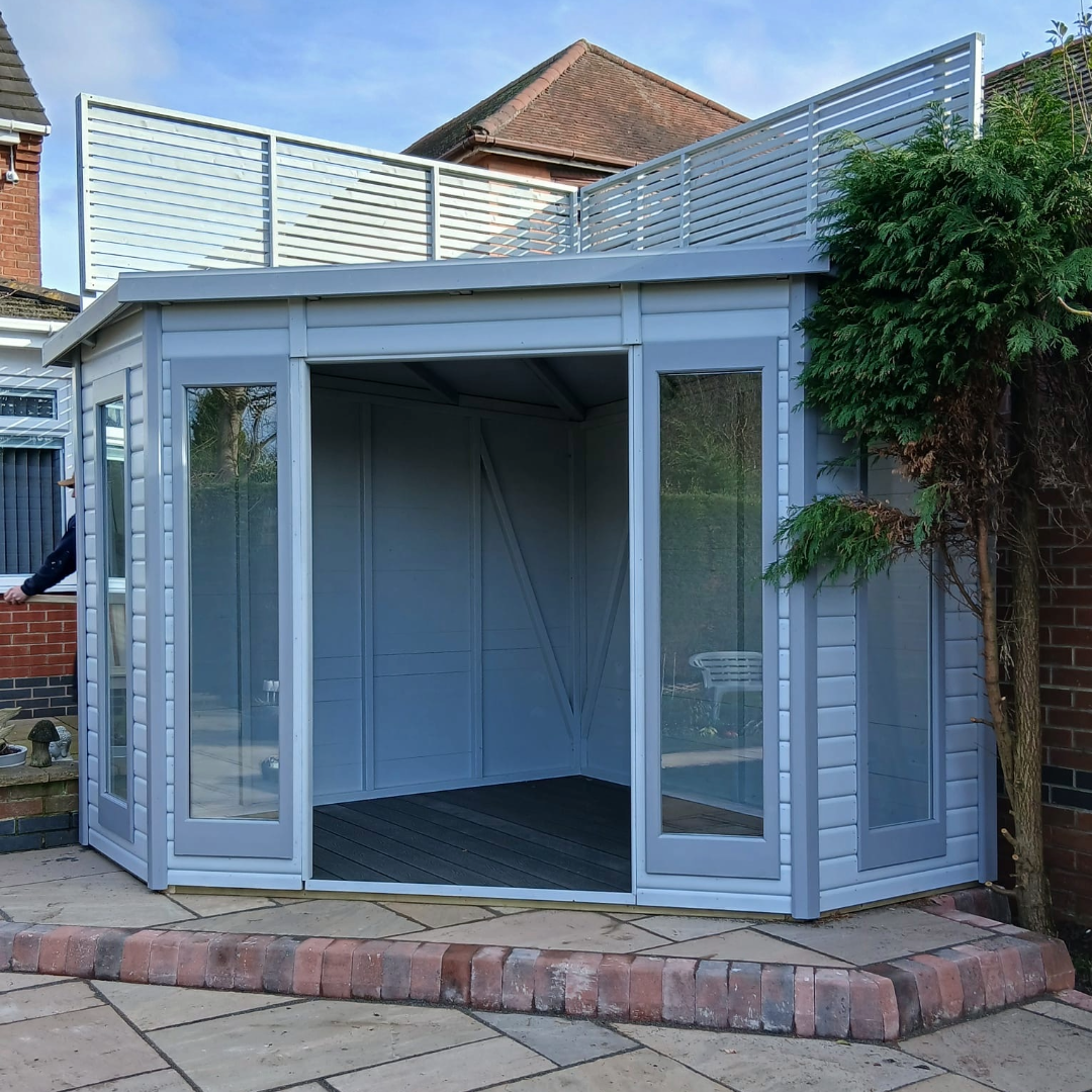 The customer asked if we could build this 2.7m x 2.7m open fronted corner unit with a special request for 2 large privacy panels to be manufactured and then colour coated the same as the unit to be fitted up in the air to screen a nosy neighbour… which we dutifully obliged.